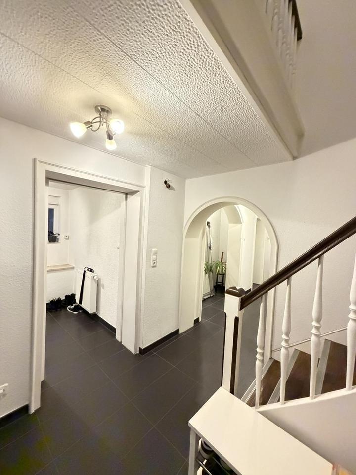 Das Erdgeschoss überzeugt durch einen großzügigen Wohnbereich mit Kaminanschluss, der den zentralen Treffpunkt des Hauses bildet. Große Fenster sorgen für eine freundliche, lichtdurchflutete Atmosphäre. Die hochwertige Miele-Einbauküche mit modernen Elektrogeräten, der offene Essbereich sowie ein vielseitig nutzbares Gästezimmer – ideal auch als Büro – schaffen ein komfortables Wohnumfeld. Ein bodengleiches, hochwertig ausgestattetes Duschbad, ein separates Gäste-WC sowie der praktisch gelegene Hauswirtschafts- und Technikraum auf Terrassenebene runden diese Etage ab. Vom Wohn- und Essbereich gelangen Sie direkt in den liebevoll angelegten Garten mit idealer Südwest-Ausrichtung, der reichlich Platz für Erholung, Familienaktivitäten und gemütliche Stunden im Freien bietet.