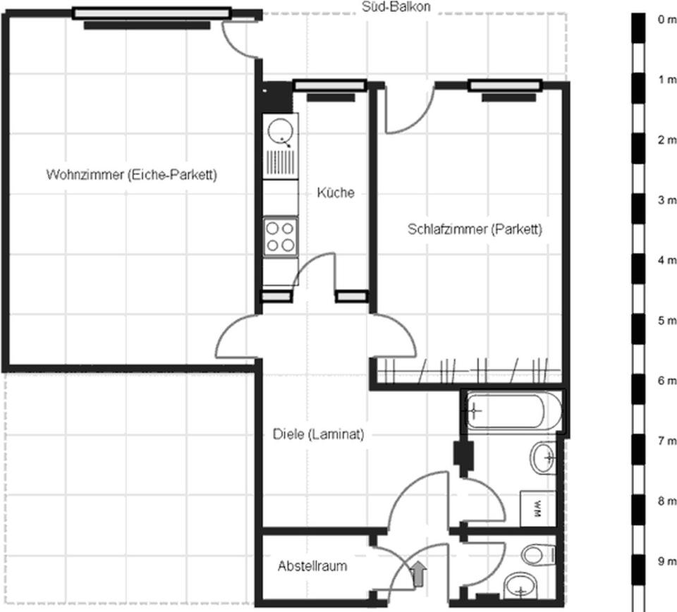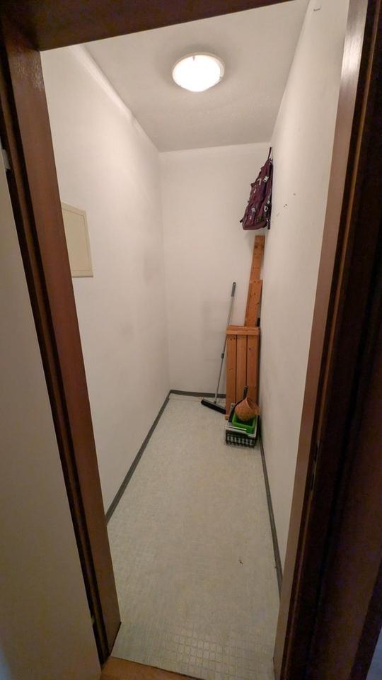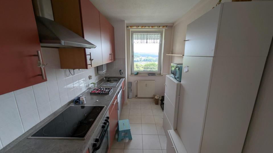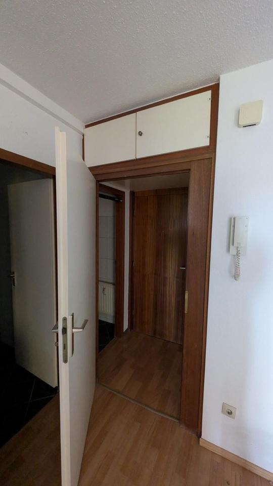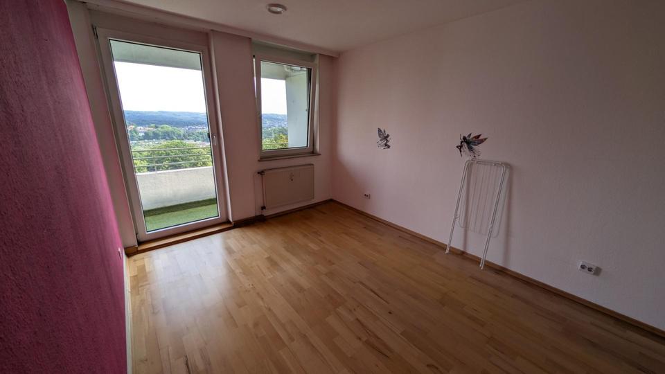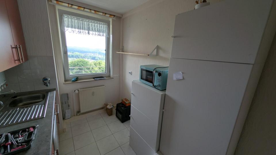Diese gut geschnittene Wohnung für 1-2 Personen mit Traum-Blick Richtung Elberfeld/Hardthöhen und Süd-Balkon verfügt über ein großes Wohnzimmer (Parkettboden) mit Balkonaustritt sowie ein geräumiges Schlafzimmer (ebenfalls Parkettboden und Balkonaustritt). Vom Eingang gelangen Sie über eine Vor-Diele (mit großem Stauraum-Überbau) links in einen Vorratsraum, rechts zum WC, geradeaus in eine große Diele. Von dort aus geht es rechts in das Wannenbad (mit Anschluss für Waschmaschine). Geradeaus wartet eine eingerichtete Küchenzeile, die im Kaufpreis enthalten ist (Kühlschrank separat gestellt). Links schließt sich das Wohnzimmer an, rechts das Schlafzimmer.