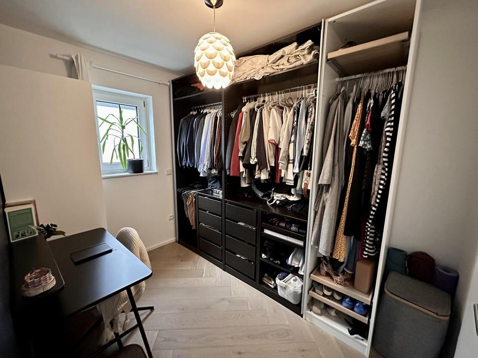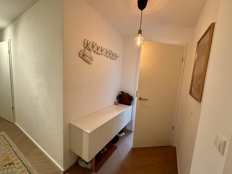 Es gibt einen Wohn-/Essbereich, 2 Schlafzimmer, eines davon mit separater Ankleide. Ein großzügiges Bad mit Fenster, Waschmaschinenanschluss, Badewanne und 1,60m tiefer, bodengleicher Dusche. Die Küche wurde bei Bezug neu eingebaut und ist mit hochwertigen Geräten (Siemens, Neff) und einer Silestone Arbeitsplatte ausgestattet. Insgesamt wurde auf hochwertige Materialien geachtet, da die Wohnung selbst genutzt wurde.