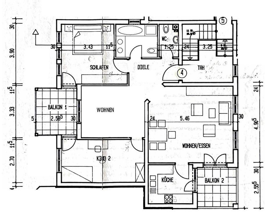 Auf rund 94 m² bietet sie eine großzügige Raumaufteilung mit einem offenen Wohn- und Essbereich (ein Zimmer wurde bewusst geöffnet), zwei Schlafzimmern, einer separaten Küche sowie einem Bad mit Dusche und Badewanne. Ein zusätzliches Gäste-WC ergänzt den Grundriss.