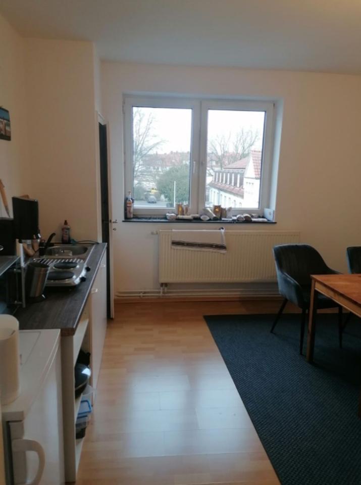 Die großzügige Wohnküche bietet ausreichend Platz für eine Essecke und lädt zu gemeinsamen Mahlzeiten ein. Das Wohn-/Schlafzimmer ist durch eine Wand praktisch unterteilt: Hinter der Wand lässt sich das Bett platzieren, sodass Wohnen und Schlafen räumlich voneinander getrennt sind.