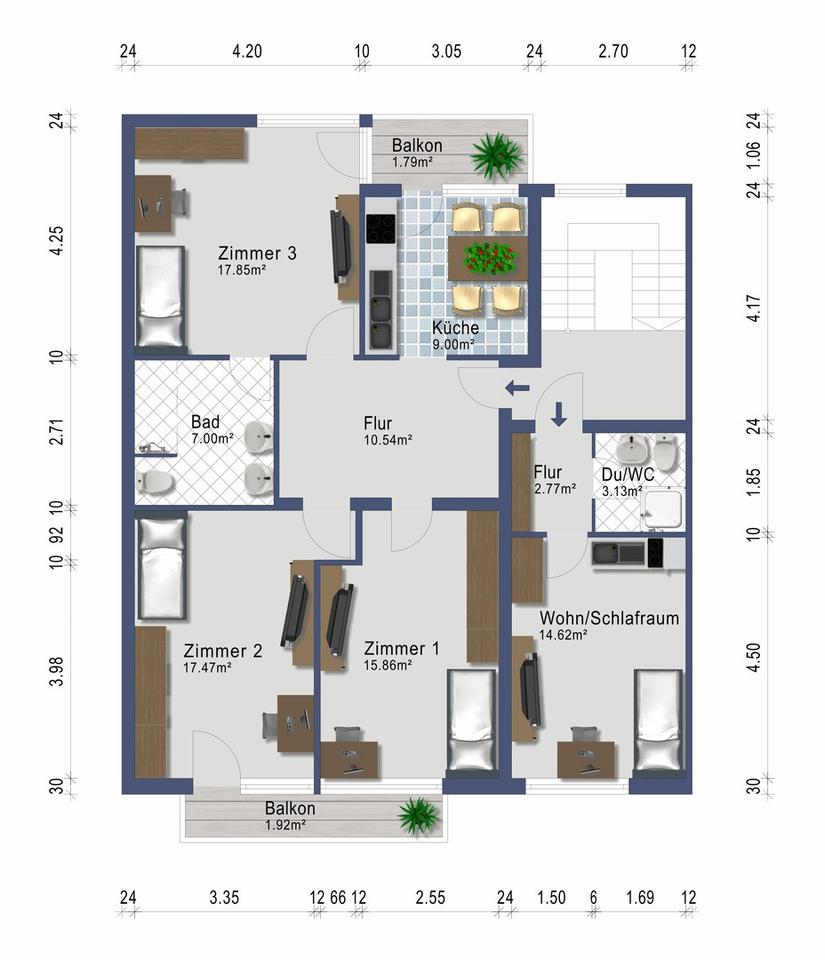 Das Objekt verfügt über 4 x 3-Zimmer-Wohnungen und 2 x 1-Zimmer-Wohnungen.