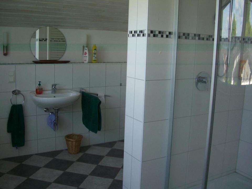 Im Obergeschoss liegt ein großer Wohnraum mit Blick über den Garten, ein sehr großes und lichtdurchflutetes Bad (Osten) sowie ein Arbeitszimmer (Südwesten). Nach Norden hin verfügt das Haus über einen Dachbodenraum, der ggf. ausgebaut werden kann.