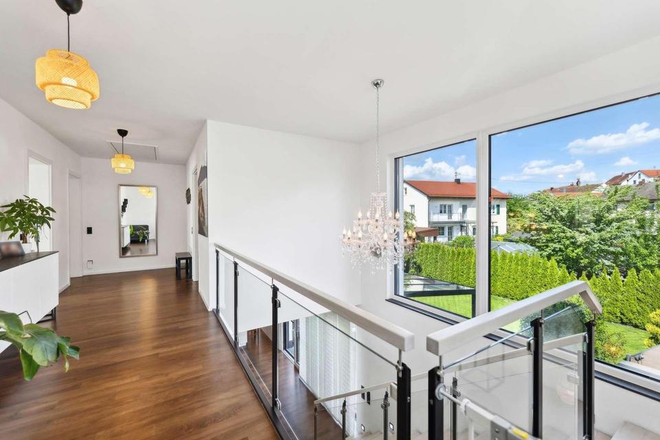 Über zwei elegant integrierte Stufen öffnet sich ein lichtdurchfluteter Wohnbereich mit erhöhter Deckenhöhe – ein beeindruckender Mittelpunkt des Hauses. Die offene Galerie und die formschöne Treppe verbinden die Ebenen harmonisch und stilvoll.