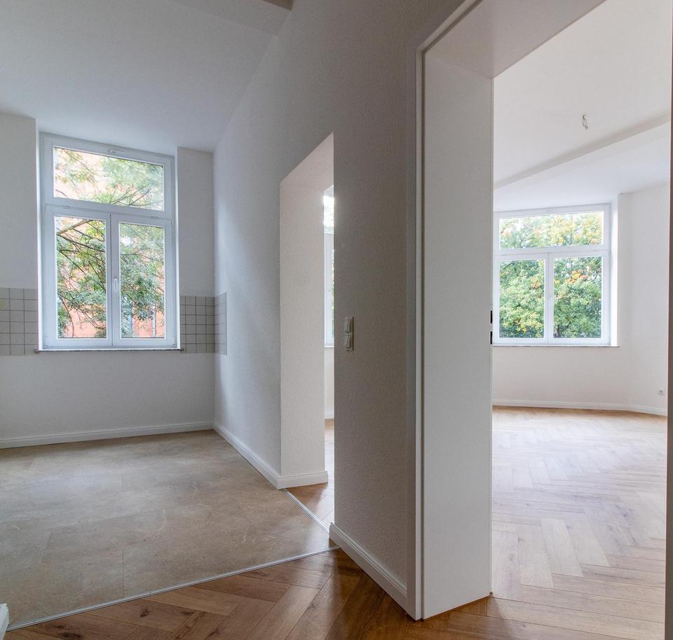 Schöne 2-Zimmer-Wohnung in der Nordvorstadt. Die Wohnung befindet sich im 1. OG in einem gepflegten Mehrfamilienhaus in der Osterweihstraße 18. 2024 wurde die Wohnung komplett renoviert, u.a. mit schönem Fischgrätboden.