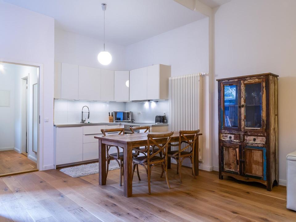 This charming one-room period apartment with approx. 50 sqm of living space is located on the ground floor of a carefully renovated building on Heinersdorfer Straße, just a few steps from Prenzlauer Berg. The apartment impresses with its classic period features, including high ceilings, oiled wooden floorboards, and a cozy sleeping alcove.
