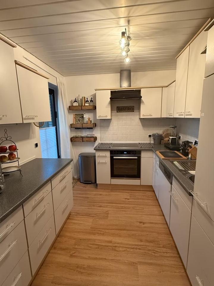 An den Essbereich schließt sich die Küche an , welche durch eine Schiebetür geschlossen werden kann. Die Küche verfügt zudem über eine Tür nach draußen zum Einstellplatz/ Garage , so kann der Einkauf auf kurzem Wege direkt in die Küche gelangen.