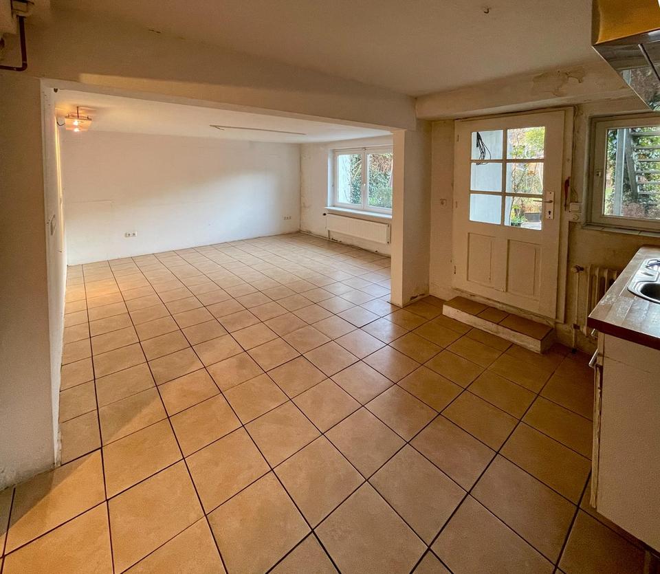 Im Souterrain befindet sich ein großer Raum, der bisher als offene Essküche (ebenerdig zum Garten) mit Zugang zur Terrasse und dem großen Südgarten benutzt wurde. Weiterhin befindet sich hier eine Waschküche / Werkzeugkeller, ein Heizungsraum mit großem Warmwasserspeicher (Warmwassersolaranlage), ein Vorratsraum, sowie eine Gästetoilette.