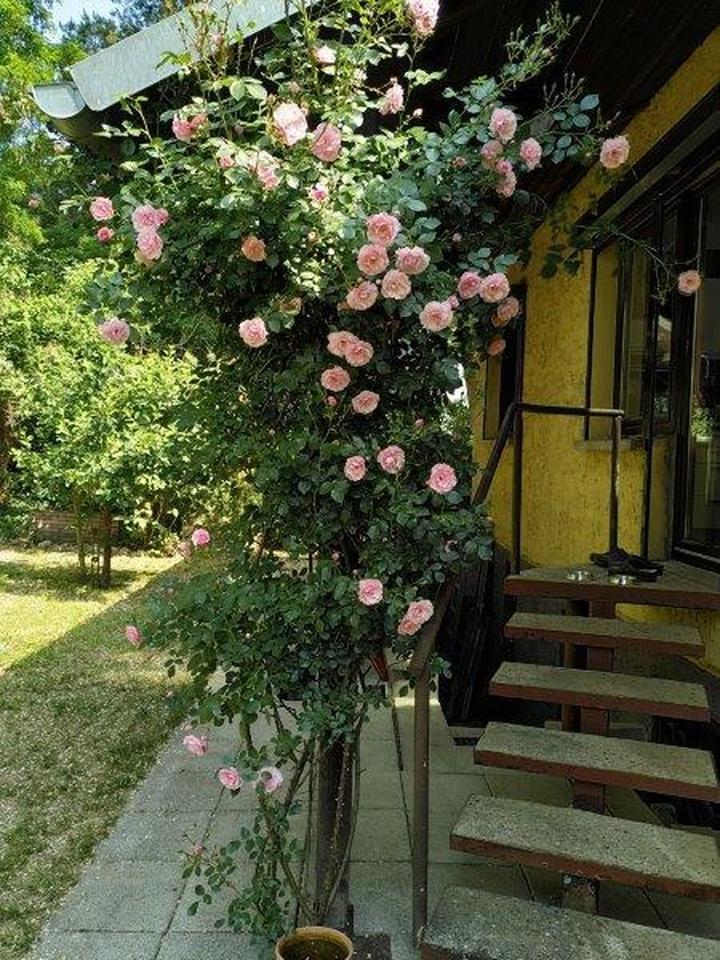 * Außenbereich & Garten: große Wiese, Obstbäume (Äpfel-, Süß- und Sauerkirsche, Pflaume), mehrere Weinstöcke (blau), Brombeerhecke und Beerensträucher, großzügige Terrasse mit natürlichem Sichtschutz durch Rosen, Sträucher, Jasmin und Bäume, Schuppen für Feuer- und Kaminholz sowie Gartengeräte