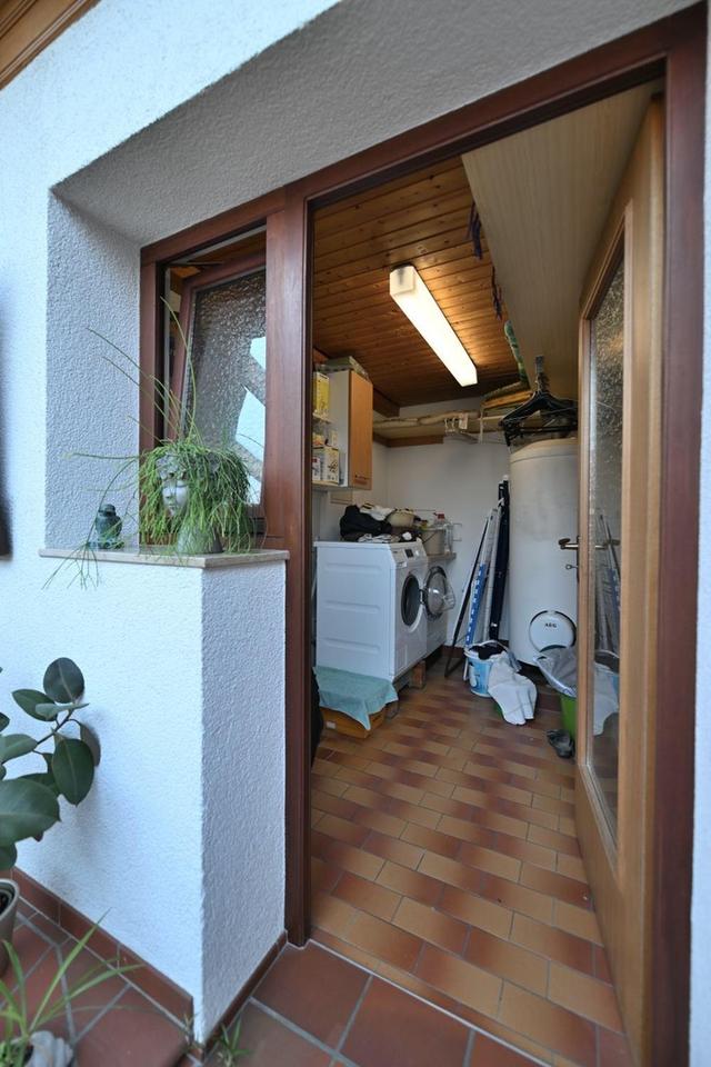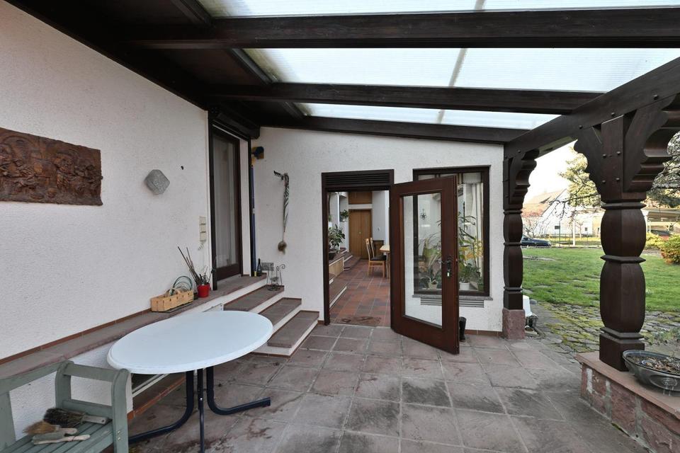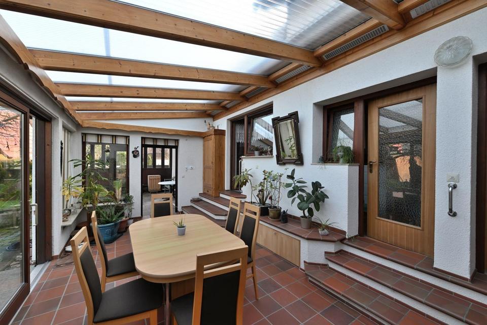 Der Wintergarten wurde in den 90er Jahren angebaut und mit einer Fußbodenheizung und elektrischer Markise (nochmals 2021 erneuert) ausgestattet.