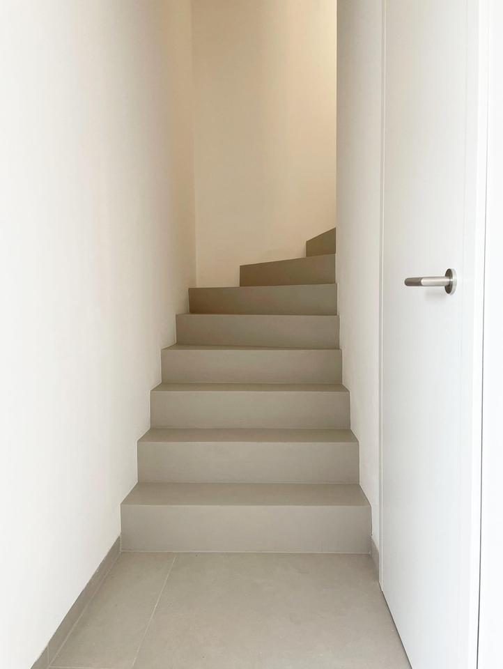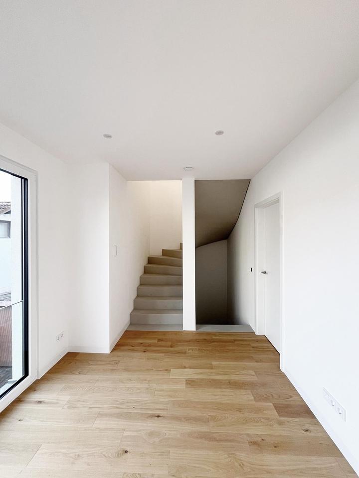 Eine moderne Betontreppe führt in das Obergeschoss. Hier werden Sie von einem großzügigen Flur mit genügend Freiraum für einen Home-Office-Platz empfangen. Dieser verzweigt direkt in zwei Kinderzimmer/Büros mit Blick in den eigenen Garten. Das geräumige Haupt-Bad verfügt bereits über einen Waschtisch inklusive Unterschrank sowie eine bodengleiche Regen-Dusche und WC.