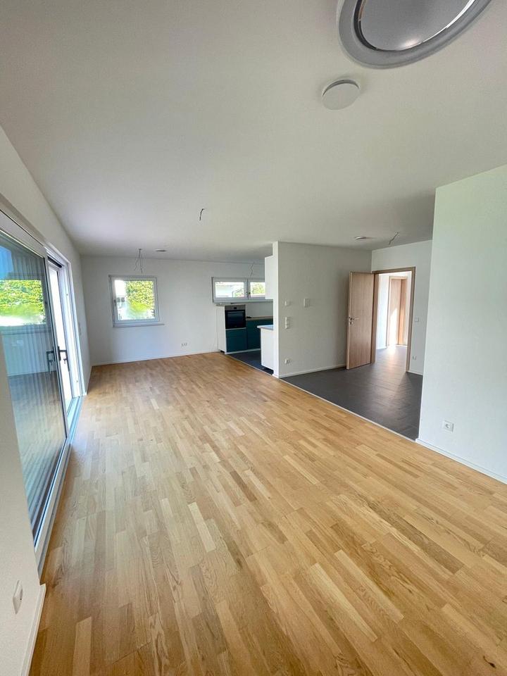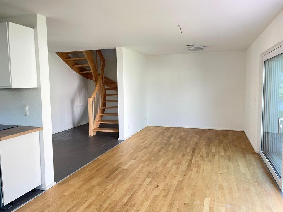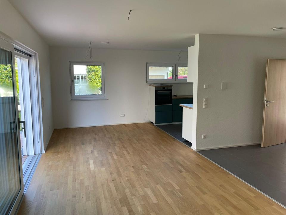 große Schiebetür mit Licht durchflutet ist. Die offene Küche (die vorhandene EBK kann bei Eigennutzung ggf. vom Mieter abgelöst werden) befindet sich etwas abgetrennt, aber dennoch gut sichtbar integriert. Über die große Hebe-Schiebetüre erreicht man die ca. 23m² große Süd-Ost-Terrasse mit angrenzender Rasenfläche und dem Garten mit ca. 110m²