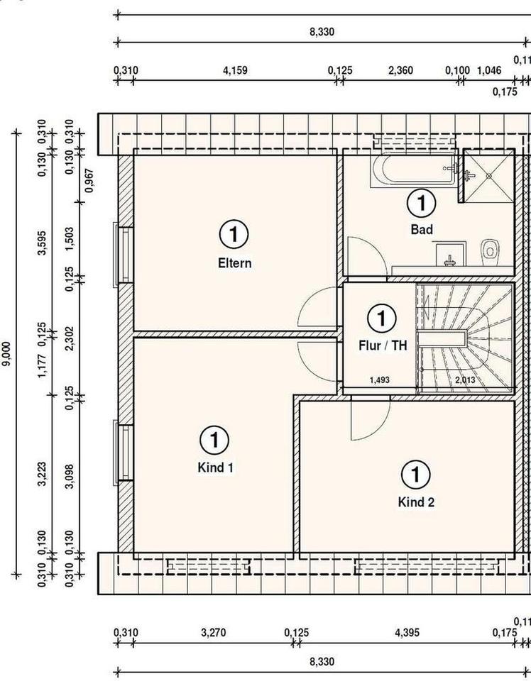 Die offene Vollholz-Treppe erweitert den Stauraum im Erdgeschoss zusätzlich und bringt Sie zugleich in das Obergeschoss. Im oberen Flur angekommen befindet sich rechter Hand das modern ausgestattete Badezimmer mit getrennter Dusche und Badewanne sowie elektrisch beheiztem Handtuchhalter, Waschbecken und WC. Weiter im Obergeschoss befinden sich drei ca. gleich groß aufgeteilte Räume/Schlafzimmer. Bei allen Räumen wurde auf ein sehr gutes Verhältnis zwischen Fenster- und Stellfläche geachtet, sodass Sie helle Räume und trotzdem ausreichend Platz für Stellflächen zur Verfügung haben.