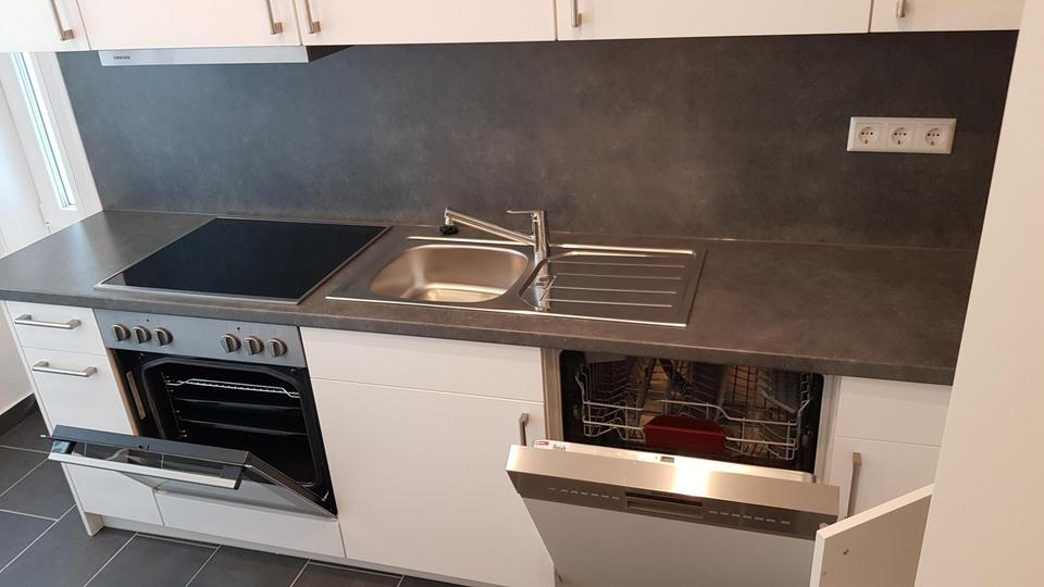 Neue Küche mit Waschtrockner, Geschirrspülmaschine, Kühlschrank und Tiefkühlschrank,