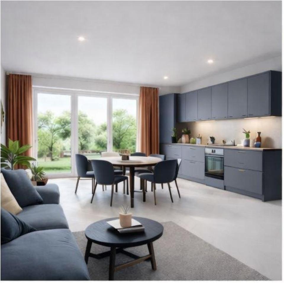 Der großzügige Wohn-, Ess- und Kochbereich mit ca. 30,57 m² bildet das Herz der Wohnung. Große bodentiefe, wärmeisolierte Fenster sorgen für viel Tageslicht und schaffen eine offene, freundliche Atmosphäre. Der direkte Zugang zur Terrasse erweitert den Wohnraum nach draußen – ideal für gemeinsame Mahlzeiten oder entspannte Abende im Freien.