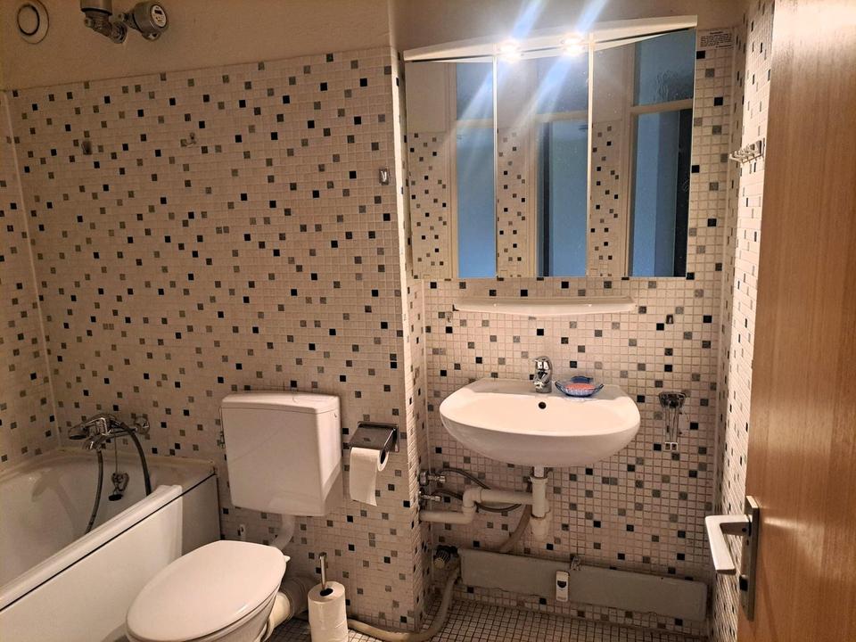 Die Wohnküche hat ebenso wie das Schlafzimmer eine Fläche von 14 m², ist mit einem pflegeleichten PVC/Linoleum-Boden ausgelegt. Die Küche ist einige Jahre im Gebrauch, Herd, Kühlschrank und Spühlmaschine funtionieren problemlos. Das Wohnzimmer ist gut 20m² groß, vorgelagerter Balkon mit Blick ins Grüne für angenehme Sommerabende. Im innen liegenden Badezimmer findet sich eine Badewanne, WC und ein Waschmanschinenanschluß. Hier könnte man bei Selbstnutzung eine Umgestaltung überlegen.