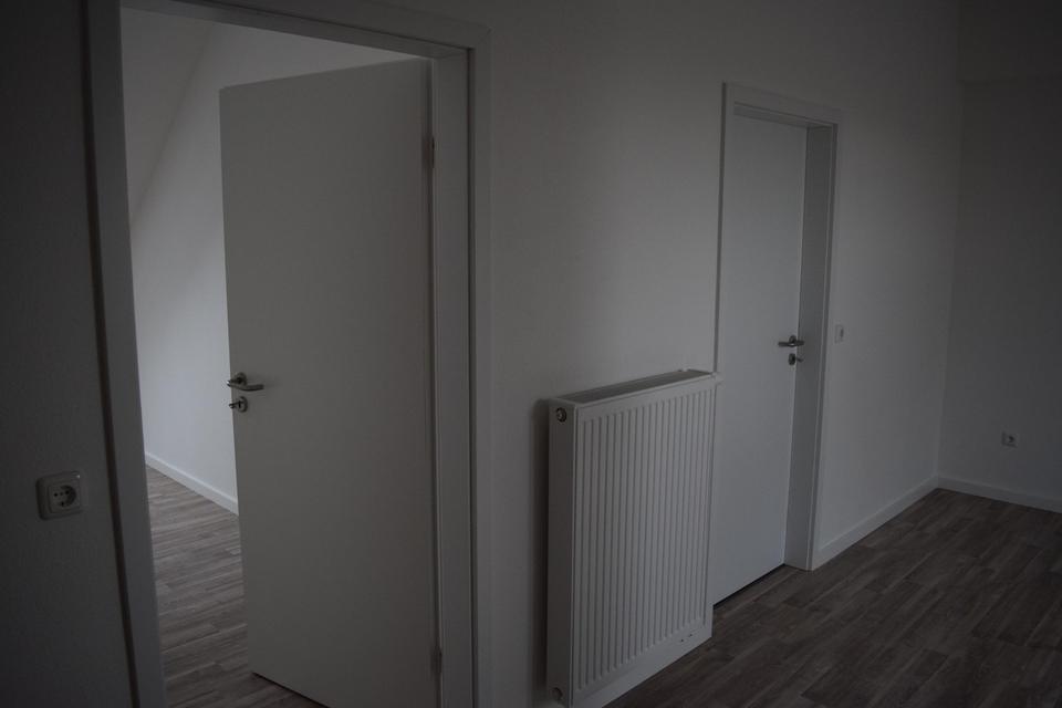 66,6 qm reine Fläche, 55,6 nach Wohnflächenberechnung (Dachschräge), 2 gleiche Räume plus ein etwas größerer davor (dort Anschlüsse für eine mögliche kleine Küchenzeile), großes Bad, Nord-Balkon mit nutzbar.