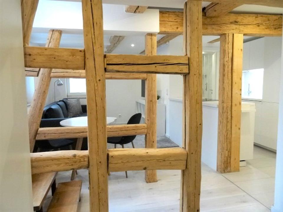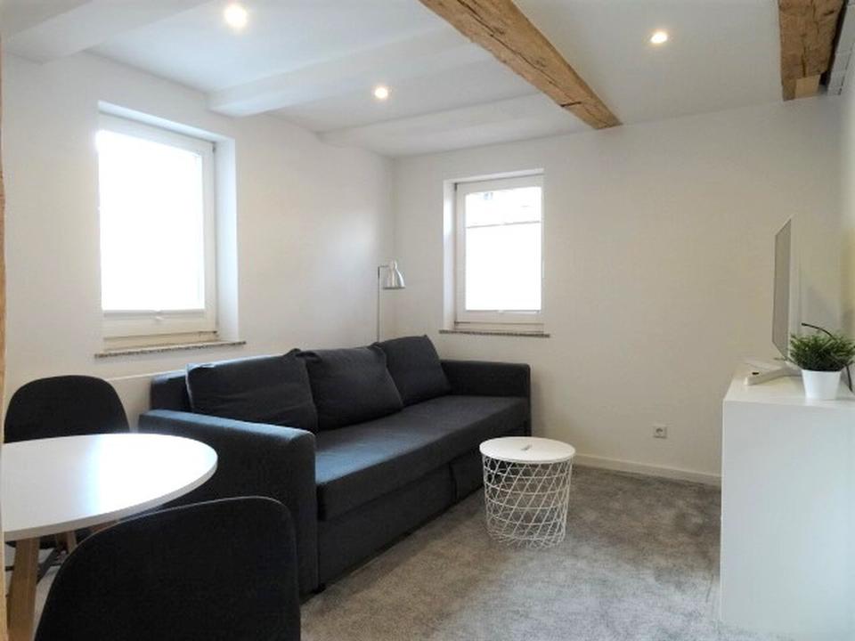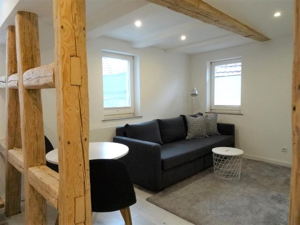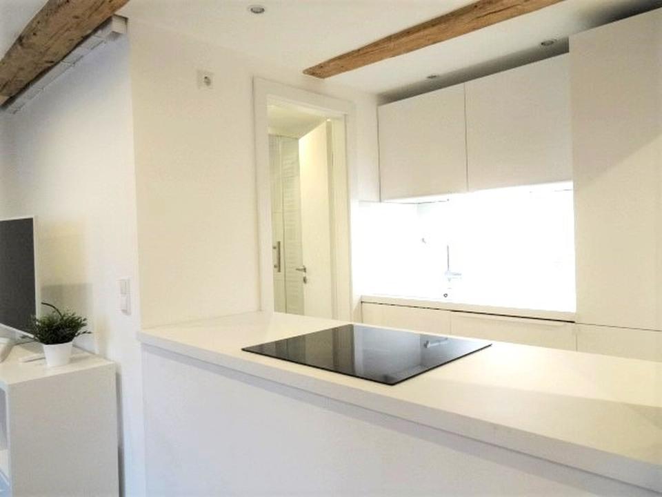 Bei möblierter Vermietung ist im Wohnzimmer die Einrichtung sehr geschmackvoll und bietet ein gemütliches Sofa mit Couchtisch sowie einen Esstisch. Die weiße zum Wohnzimmer offene Inselküche ist mit modernen Möbeln und Geräten ausgestattet.
