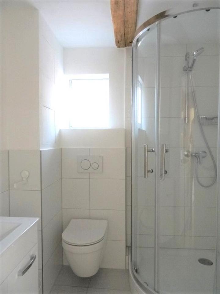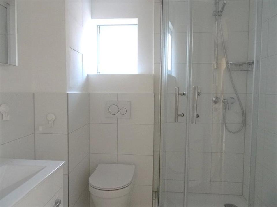 Das Tageslicht Bad mit Dusche hat moderne Armarturen.