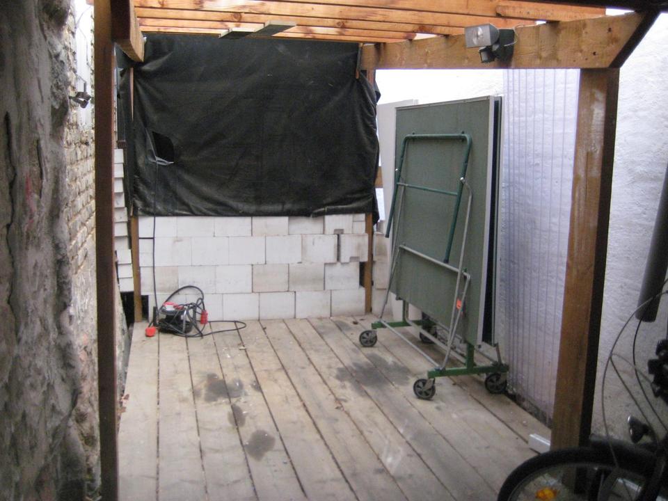 Kleiner Holzschuppen: Bietet Platz für Brennholz, Spalter, Fahrräder, etc.