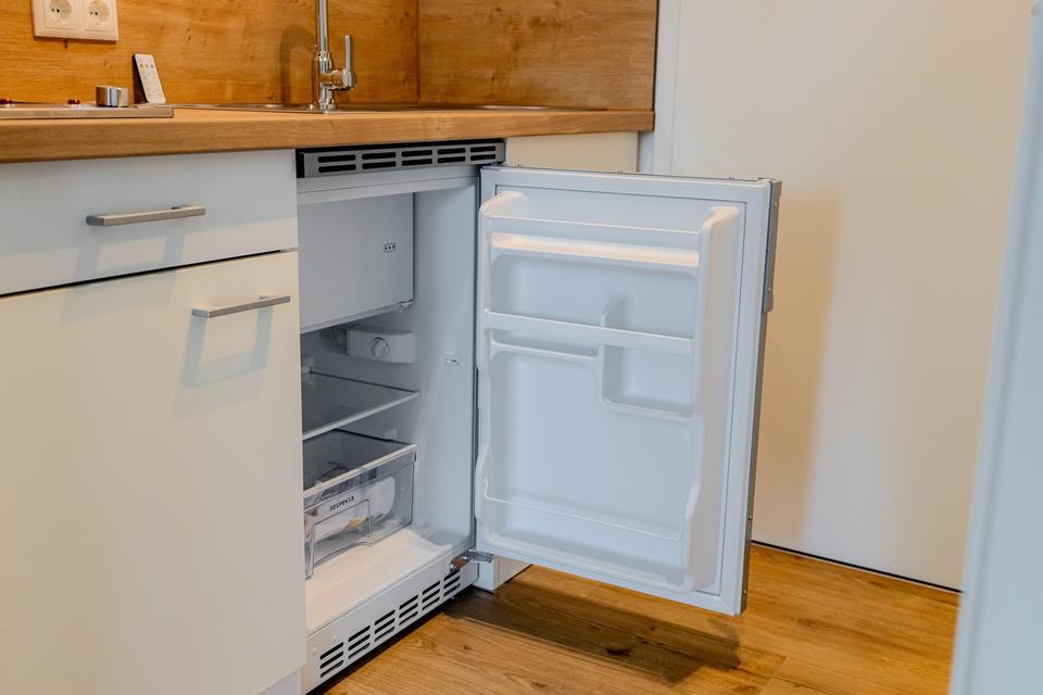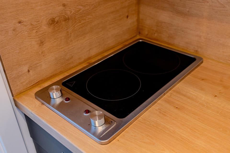 – Neue, moderne Einbauküche mit Kühlschrank, Gefrierfach, Mikrowelle, Cerankochfeld und Edelstahlspüle