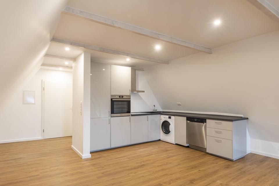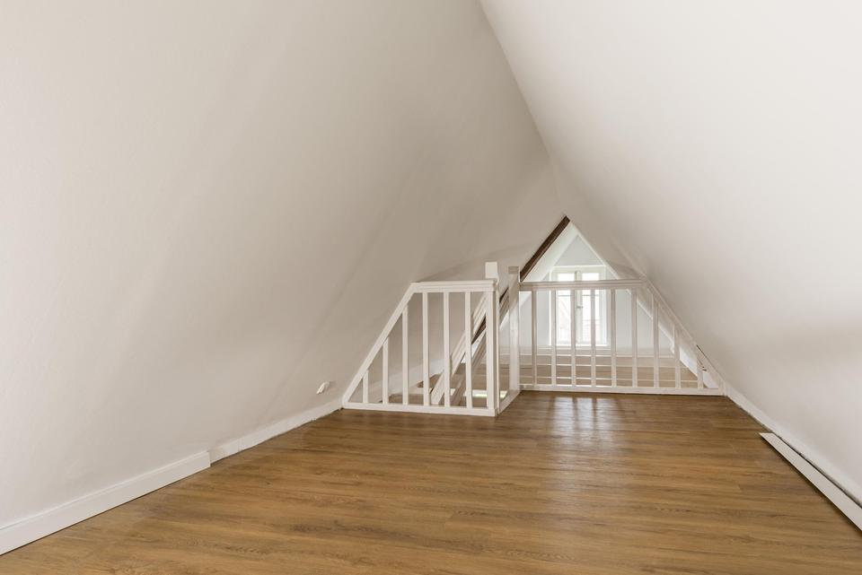 Das zum Verkauf stehende Dachatelier im 2. OG besticht durch seine lichtdurchflutete Raumkonzeption mit freier Sicht auf Dachbalken in elegantem Weiß. Der honigfarbene Parkboden sorgt bereits bei Betreten für ein behagliches Wohlfühlambiente.