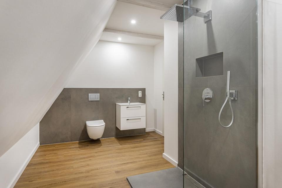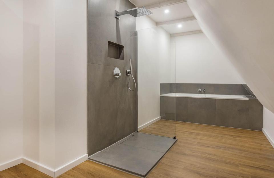 Das Badezimmer verfügt u. a. über eine Dusche (mit einer Hans Grohe Raindance E100-Airjet-Kopfbrause) und eine Badewanne (Marke: Ideal Standard).