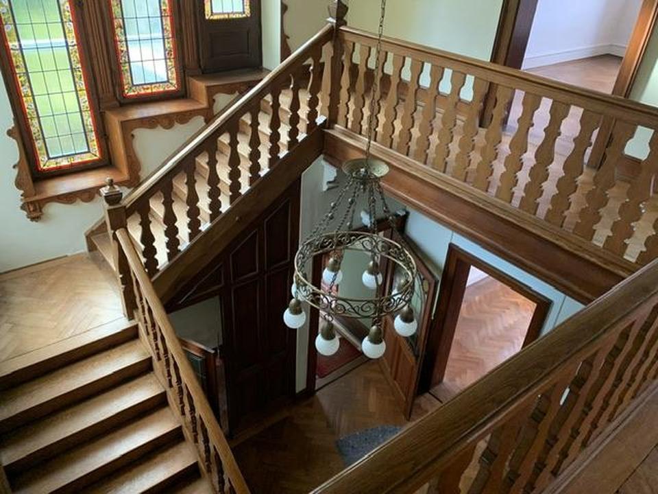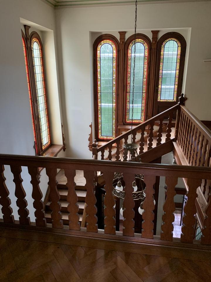 Edles Fischgrätenparkett, hohe bunte Glasfenster, weiße Türen mit kunstvollen Verzierungen und Ornamenten, dezente Stuckelemente an den Decken, großflächige Fenster mit originalen Griffen und Rollläden, Garage, toller Garten.