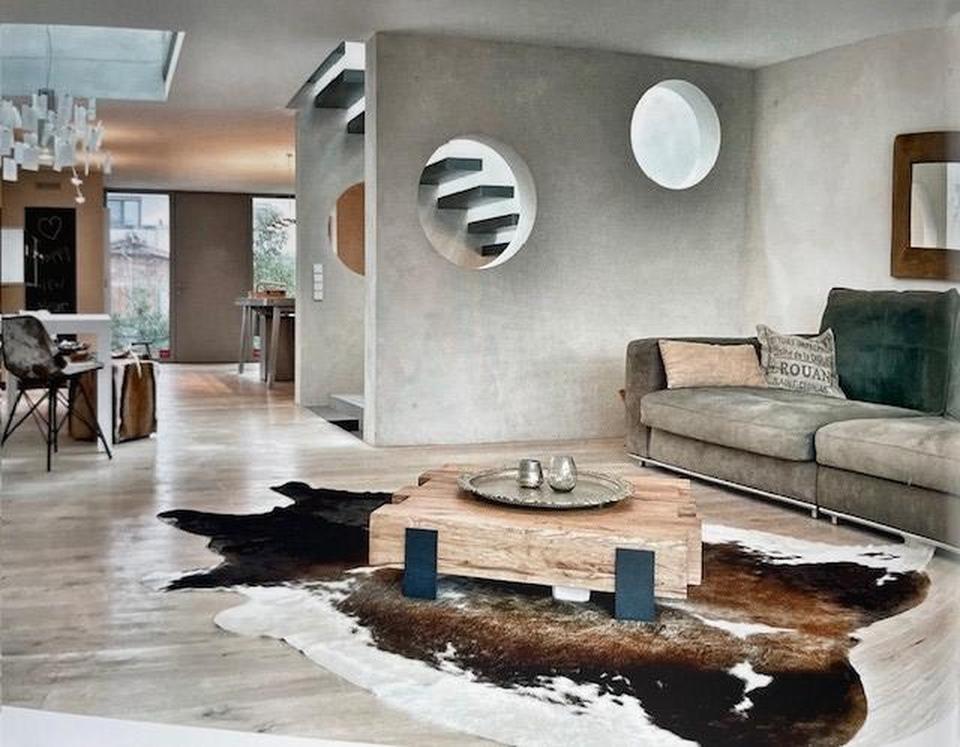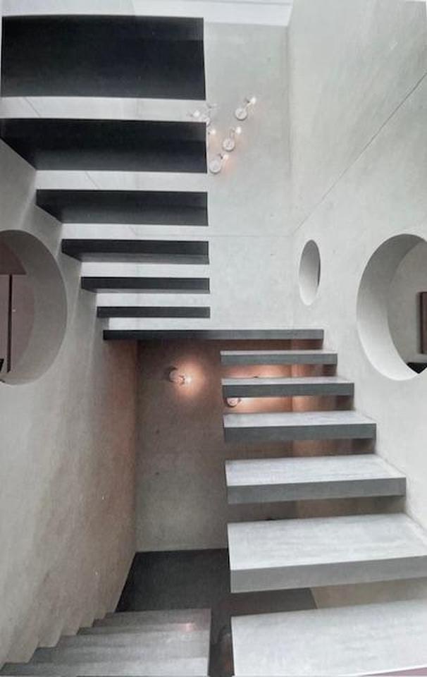 Verbindende Elemente der drei Ebenen ist eine skulpturale, wie schwebend erscheinende Design-Kragarmtreppe aus Sichtbeton, handgehobelte, gekalkte Eichen-Echtholzdielenböden sowie Wände in Sichtbetonoptik. Dieser gekonnte Einsatz von kühleren Nichtfarben und warmen Naturmaterialien machten den besonderen Reiz des Hauses aus. Weitere verbindende Design-Elemente sind die im ganzen Haus eingesetzten Le Corbusier Licht-, Jalousie- und Tastschalter.