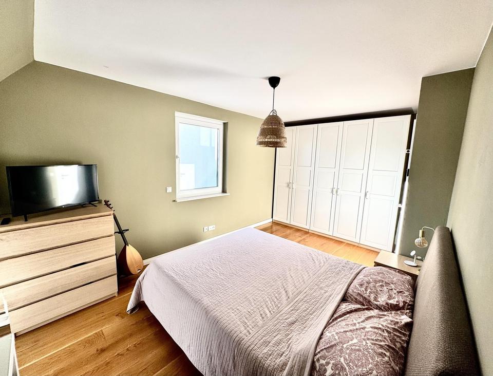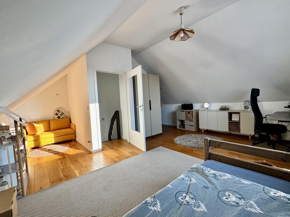 Die Küche kann ohne großen Aufwand zu einer offenen Wohnküche umgebaut werden. Ebenso lässt sich das große Zimmer im Obergeschoss mit wenigen Maßnahmen in zwei eigenständige Räume teilen – ideal für wachsende Familien oder Homeoffice-Bedarf.