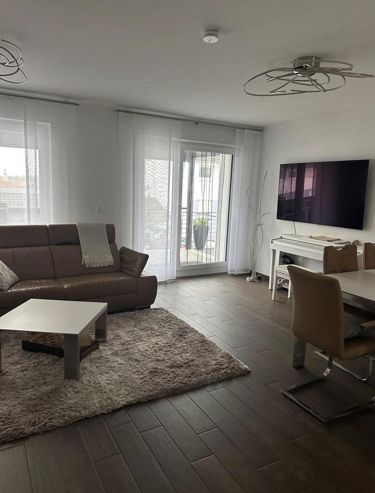 Großer heller Wohn-/Essbereich mit hochwertiger weißer Einbauküche (Siemens-Geräte, Keramikspüle, Keramik-/Stein-Arbeitsplatte), Gäste-WC, großer Balkon mit Glasdach und elektrischen Rollläden, Treppe vom Balkon in den Garten