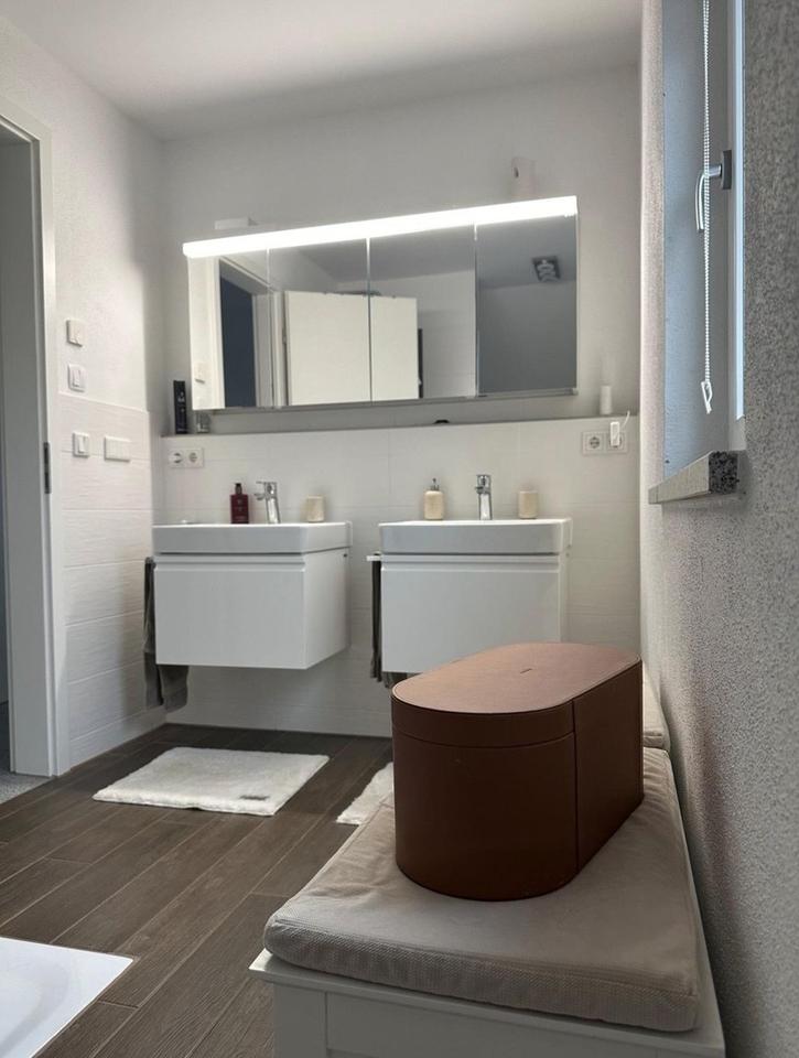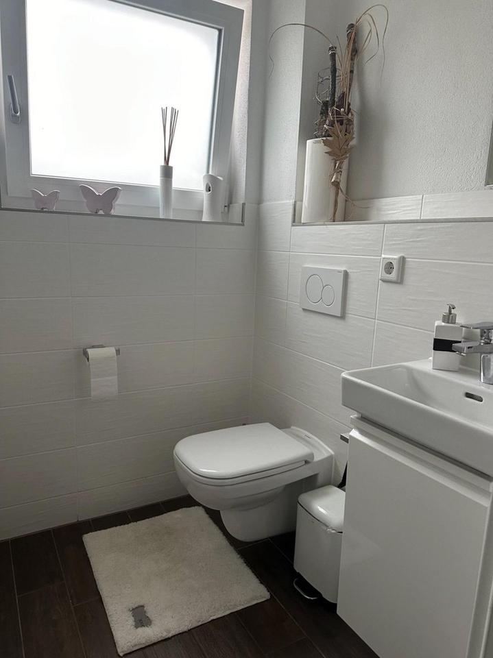 Im ganzen Haus gibt es Fußbodenheizung und elektrische Rollläden. Alle Bäder/WCs sind mit hochwertigen, weiß lackierten Möbeln ausgestattet. Der Garten mit Terrasse, Kirsch- und Apfelbaum lädt zum Entspannen ein. Garage und Carport sind inklusive.
