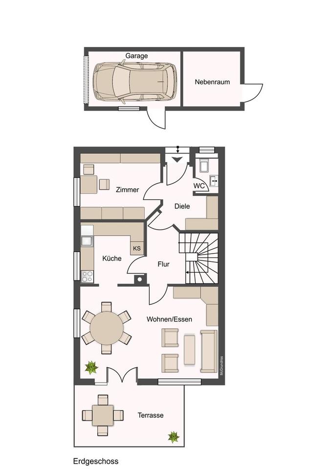 Balkon, Terrasse, Garten, Keller, Vollbad, Gäste-WC, Parkett, Laminat, Fliesen