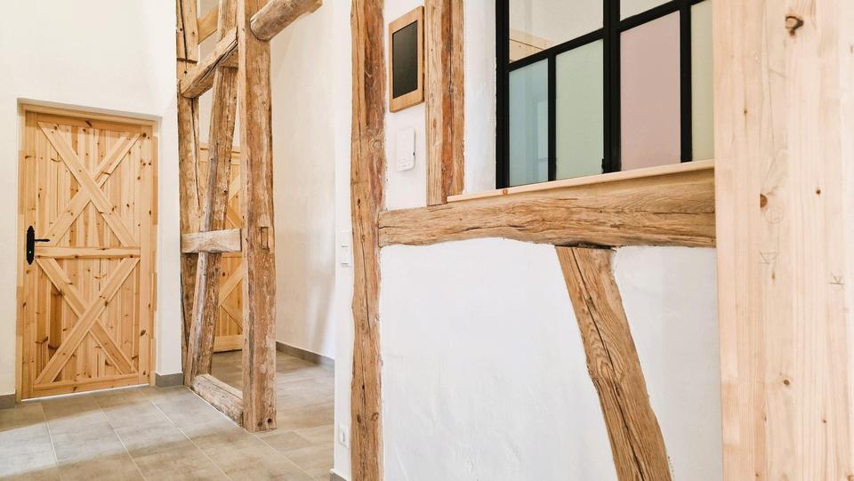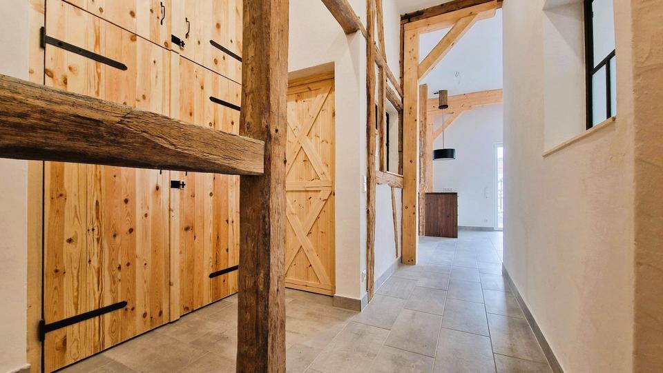 Das Fachwerkhaus, detailverliebt saniert, vereint den Charme vergangener Jahrhunderte mit modernem Wohnkomfort. Mit Lehmbauweise gestaltete Wände sorgen nicht nur für ein außergewöhnliches Raumklima, sondern regulieren auf natürliche Weise die Feuchtigkeit und schaffen eine angenehme, gesunde Wohnatmosphäre.