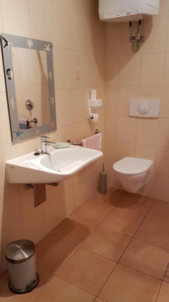 Zur größeren Wohnung gehört ein barrierefrei gestaltetes Badezimmer mit Dusche, welches 2008 saniert wurde. Außerdem noch eine Küche, Wohnzimmer, Schlafzimmer, Arbeitszimmer/Kinderzimmer und ein zweites Bad mit WC und Dusche.