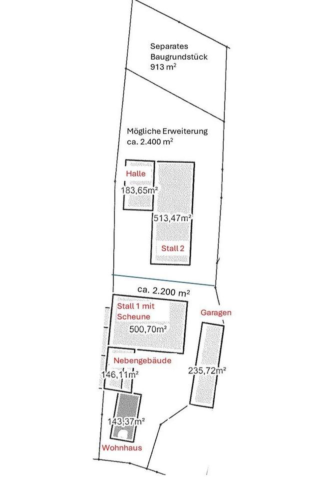 – Grundstück: 2.200 qm – Option für Erweiterung auf insgesamt ca. 4.600 qm und weiteres Baugrundstück (913 qm)