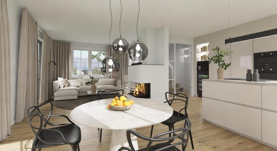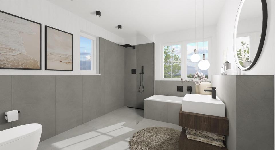 Die Grundrisse im Obergeschoss unterscheiden sich in der Lage des Balkons und der Anzahl der Badezimmer. Edle Echtholz-Parkettböden verleihen dem gesamten Haus eine warme und einladende Atmosphäre. Das Haus bietet bis zu drei elegant gestaltete Badezimmer, die mit hochwertigen Sanitäreinrichtungen von Villeroy & Boch ausgestattet sind und verbinden Komfort und Eleganz.