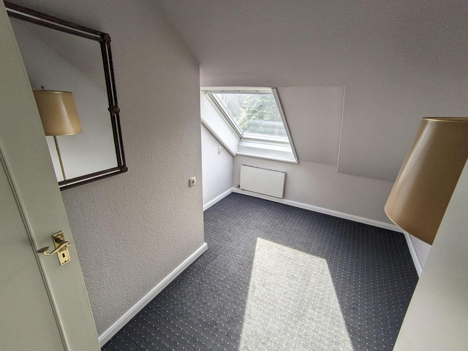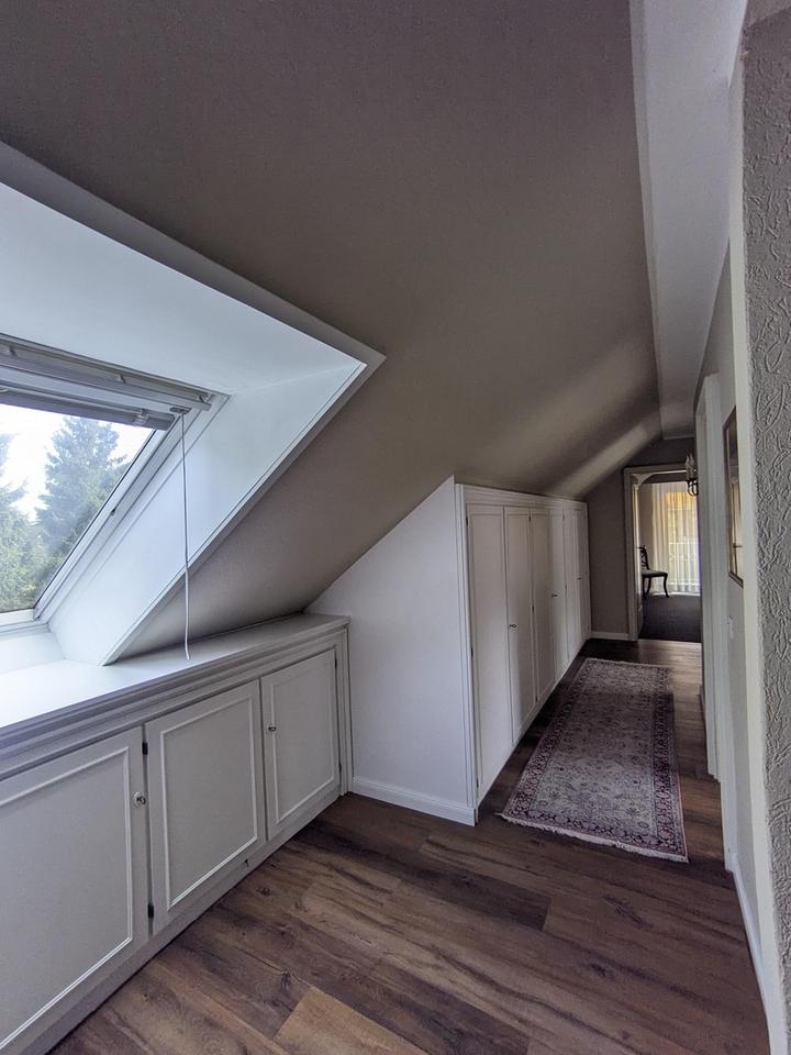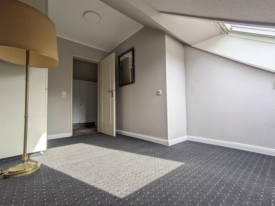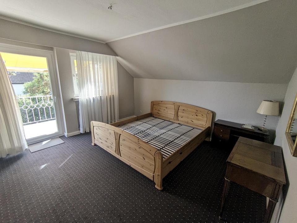Im Obergeschoss gibt es ein großes Schlafzimmer mit direktem Zugang zum sonnenverwöhnten Balkon. Angrenzend hierzu befinden sich zwei Räume, die gut als Ankleidezimmer oder Kinderzimmer genutzt werden können. Weiterhin steht im Obergeschoss im Bereich des ehemaligen Bodenraums ein zusätzliches Zimmer zur Verfügung, das ideal als separates Jugendzimmer oder alternativ als komplett abtrennbarer Gästebereich mit Zugang zum Vollbad genutzt werden kann. Ein weiteres Duschbad befindet sich unmittelbar daran angrenzend.