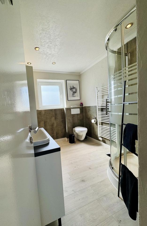 • Modernes Bad mit Dusche, WC, Waschbecken und Waschmaschinenanschluss
