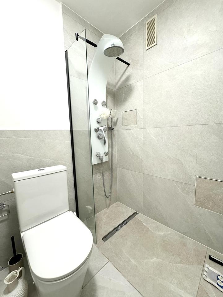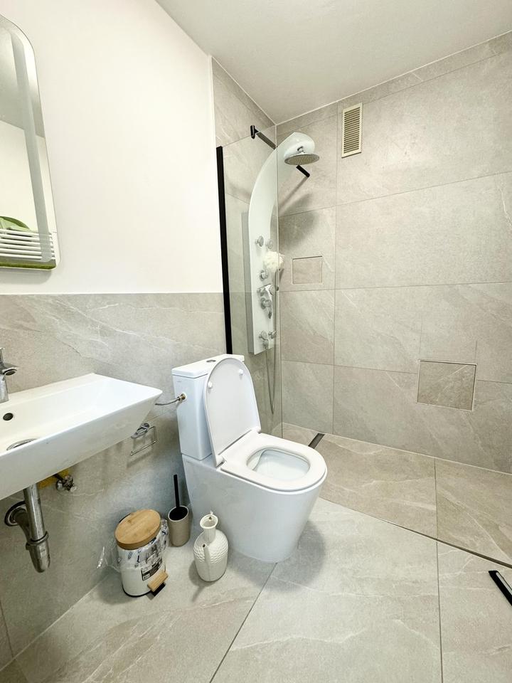 Das moderne Badezimmer rundet das stilvolle Gesamtbild ab. Und dank des eigenen Tiefgaragenstellplatzes parken Sie jederzeit