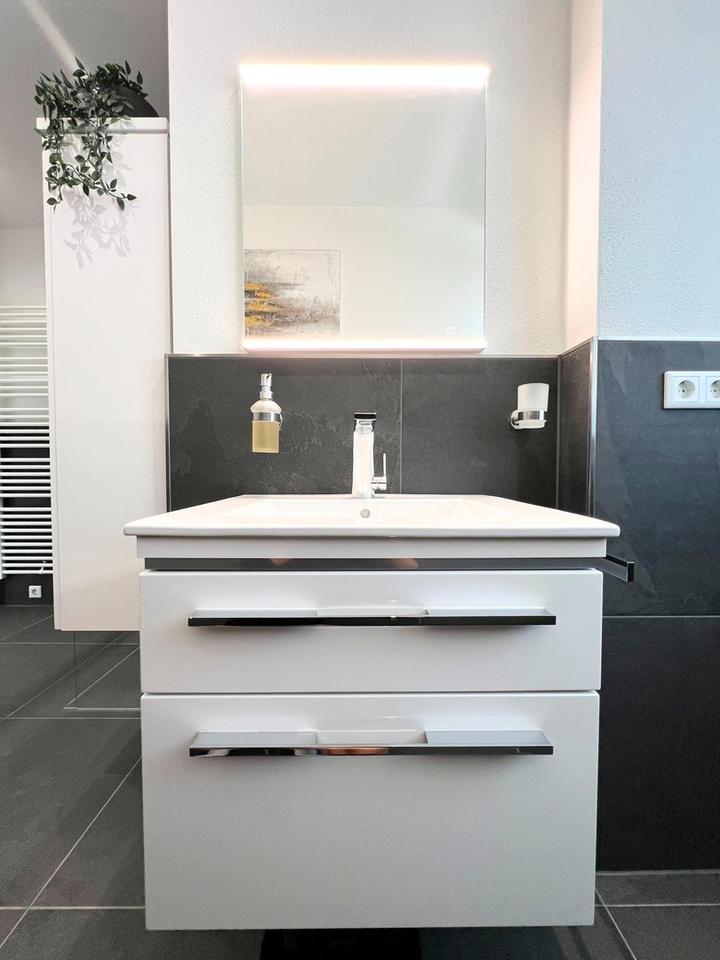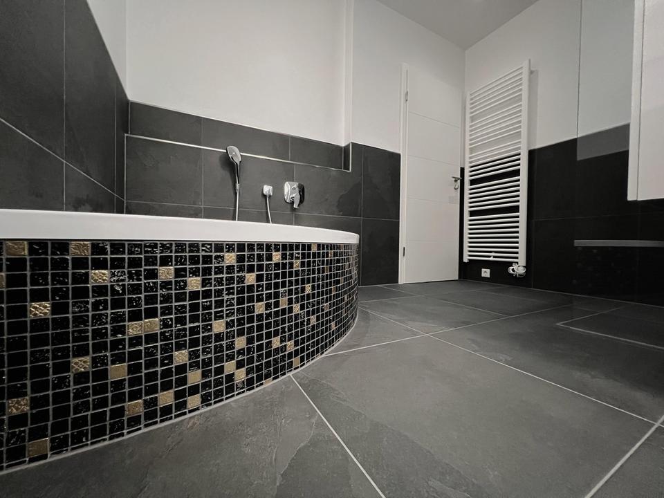 Zwei stilvolle Bäder mit eleganten anthrazitfarbenen Fliesen und Mosaikdetails bieten Komfort und Ästhetik zugleich. Ein separates Gäste-WC sorgt für Privatsphäre.
