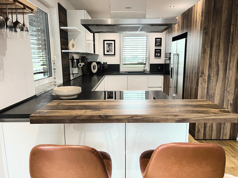 In der unteren Etage der Maisonette-Wohnung erwartet Sie ein großzügiger, offen gestalteter Wohn- und Essbereich. Die moderne, maßgefertigte Küche mit Thekenfront & Sitzmöglichkeit im offenen Design und hochwertigem Side-by-Side-Kühlschrank, ist nicht nur ein funktionales Highlight, sondern auch ein echter Blickfang – perfekt für gesellige Abende und kulinarische Momente.