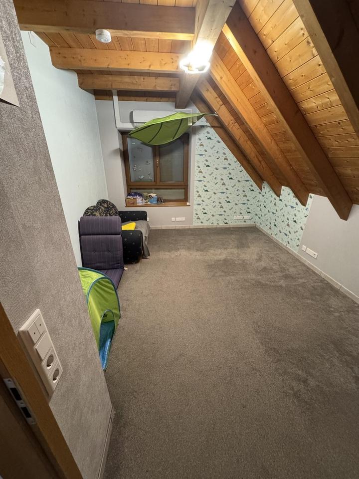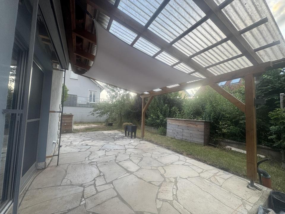 Zum Verkauf steht ein modern ausgestattetes, gepflegtes Einfamilienhaus mit separater Einliegerwohnung in Obervolkach. Das Gebäude aus dem Jahr 1997 ist solide gebaut: 50 cm starke Poroton-Außenwände, 25 cm Holzfaser-Aufdachdämmung und ein sichtbarer Dachstuhl aus gehobelten Balken. Die offene Holzbalkendecke im Erdgeschoss verstärkt den warmen, hochwertigen Charakter des Hauses.
