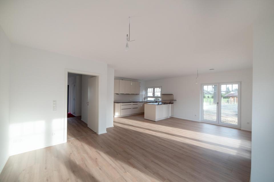 Die Diele führt Sie in den großen Wohn- und Essbereich. Die Küche ist schon eingebaut, dahinter verbirgt sich noch eine kleine Speisekammer. Eine barrierefreie Tür führt Sie auf die große Terrasse.
