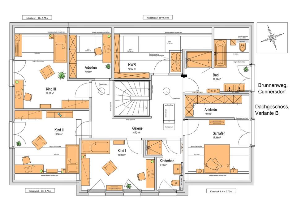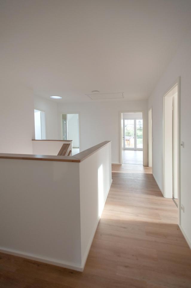 Eine Buchenholztreppe führt Sie ins OG. Zwei Tageslichtspots erhellen hier das Treppenhaus und die Galerie energiesparend. Außer dem Hauptbad mit Dusche, Wanne mit toller Aussicht über die Felder gibt es im OG noch ein weiteres Bad mit Dusche. Wir haben es „Kinderbad“ genannt. Wer schon mehrere Kinder hat, weiß das zu schätzen.