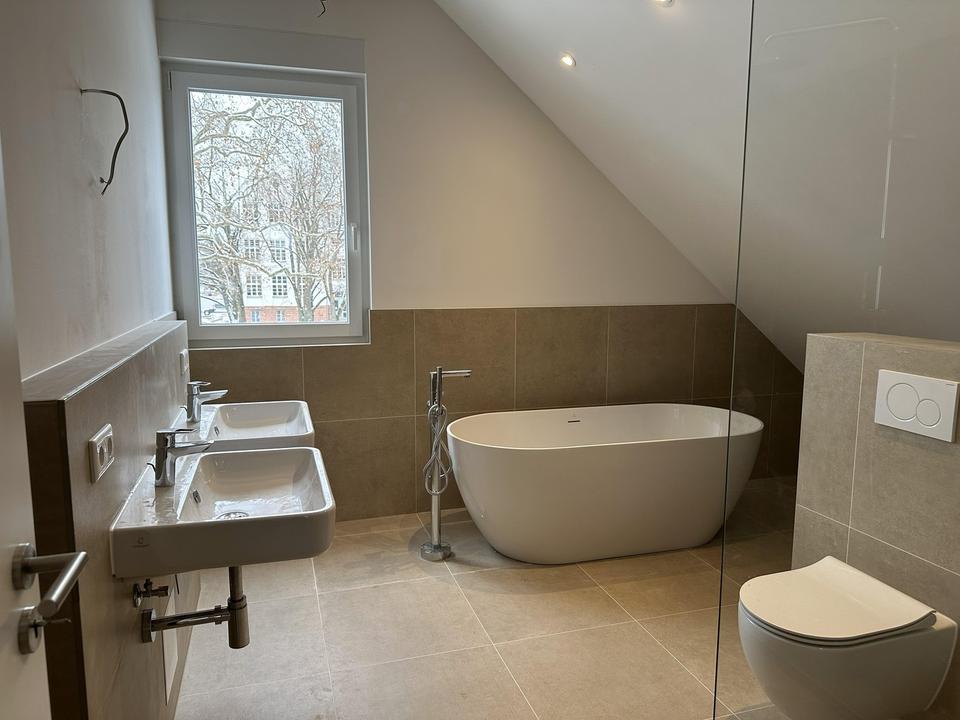 • Bad: Tageslichtbad mit freistehender Badewanne und separater Dusche. Hochwertige Sanitärobjekte.