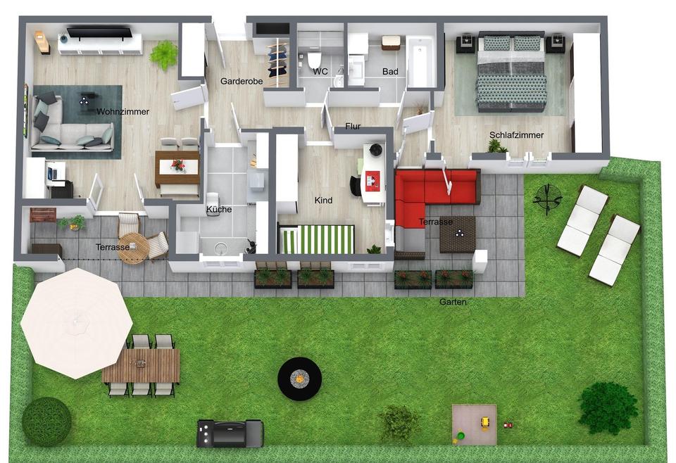 Der angrenzende private Garten mit rund 80 m² Gesamtfläche bietet zusätzlichen Freiraum, ob für kleine Spielbereiche, ein Kräuterbeet oder sonnige Stunden im Grünen – hier genießen Sie echten Wohnkomfort mit Outdoor-Feeling.