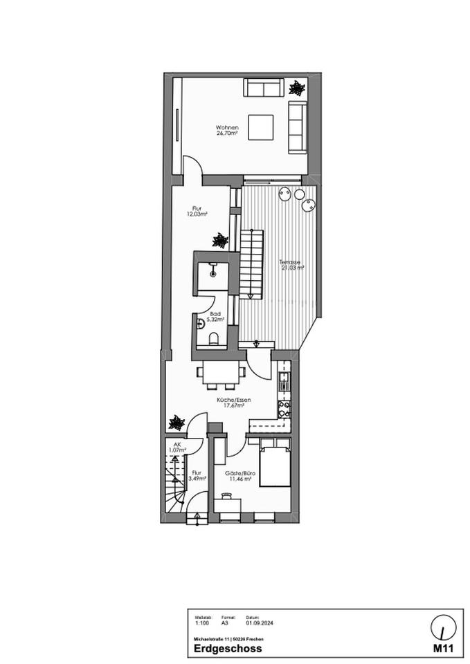 Das Highlight dieser Etage ist die großzügige Dachterrasse von etwa 40 m². Ob Sonnenbaden, Grillen oder ein geselliger Abend mit Freunden – dieser Außenbereich ist perfekt für besondere Momente.