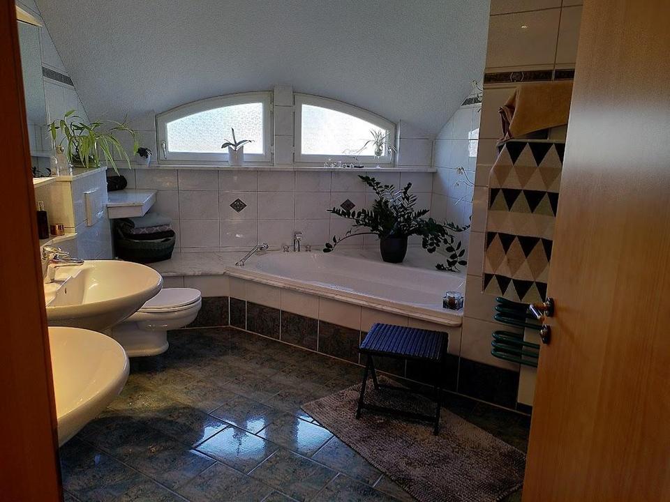 Bad: zwei Waschbecken, Wanne, separate Dusche, Fußbodenheizung, Handtuchheizkörper, zwei schmale Fenster (Sichtschutz) Weitere Ausstattungsmerkmale: hochwertige Steinböden (Fußbodenheizungen) (außer Kinder-/Gästezimmer: Teppichboden), Einbauschränke (Schreinerarbeit), maßgefertigte Einbauten im Wohnzimmer, in Marmor – Ballustrade, gepflegter Gesamtzustand.