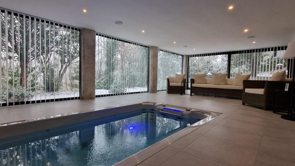 Die exklusive Architekten Villa in Trier befindet sich in einem privilegierten Wohngebiet mit nur neun Häusern und bietet eine ruhige Lage sowie einen beeindruckenden Blick über das Tal. Im Jahr 2022 wurde das Haus umfassend und hochwertig saniert. Dabei wurden sämtliche Flachdächer und die großzügigen Dachterrassen neu gedämmt und mit Alwitra-Folie abgedichtet. Ebenso wurden alle Bäder, Boden-, Decken- und Wandbeläge erneuert oder aufbereitet. Neue Aluminiumfenster mit Dreifachverglasung, eine moderne Pellet-Heizungsanlage sowie zeitgemäße Grundrissänderungen verleihen dem Haus seinen neuwertigen Zustand. Zur Ausstattung gehören Highlights wie eine Sauna, ein Schwimmbad, ein Heimkino, separate Gästebereiche und vieles mehr.Die Vorderseite des Flachdach-Hauses präsentiert sich in einem schlichten Design, während die Rückseite mit großen Fensterflächen und weitläufigen Terrassen einen freien Blick ins Tal bietet. Im Erdgeschoss erwartet Sie ein großzügiger Wohnbereich von ca. 56 m², der fließend in den stilvollen Kaminbereich (ca. 15 m²) und das Esszimmer (ca. 28 m²) übergeht. Große, nach Süden ausgerichtete Fensterfronten durchfluten die Räume mit Tageslicht. Eine vorgelagerte Terrasse mit etwa 90 m² lädt dazu ein, die Sommerabende entweder in geselliger Runde oder in Ruhe zu genießen. Der durchgehend helle Marmorboden, der im Rahmen der Sanierung aufwendig aufgearbeitet wurde, unterstreicht die hochwertige Ausstattung.Zusätzlich befindet sich auf dieser Ebene eine weitere, teils überdachte Terrasse (ca. 24 m²), die vom Esszimmer zugänglich ist und auch bei schlechtem Wetter nutzbar bleibt. Hochwertige Außenjalousien an allen Fenstern ermöglichen die individuelle Regulierung von Licht und Privatsphäre. Eine gemütliche Wohnküche mit ca. 20 m², zugänglich sowohl von der Diele als auch vom Esszimmer, ist mit einer Einbauküche und hochwertigen Elektrogeräten ausgestattet, die im Kaufpreis enthalten sind. Außerdem umfasst das Erdgeschoss ein Büro oder Gästezimmer (ca. 16 m²) sowie ein modernes Gästebad mit bodengleicher Regendusche.Über eine helle Marmortreppe gelangt man in das Obergeschoss mit fünf Schlafzimmern und zwei bis drei Bädern. Die vier Kinderzimmer (je ca. 15 m²) sind lichtdurchflutet und verfügen jeweils über Terrassenzugang sowie einen herrlichen Ausblick ins Tal. Das Elternschlafzimmer mit Ankleide (ca. 26 m²) bietet ein luxuriöses Bad en Suite mit freistehender Badewanne und Multifunktionsdusche. Hochwertiger Teppichboden prägt diese Etage, während die Bäder mit Fußbodenheizung ausgestattet wurden.Im Untergeschoss des Hauses befindet sich eine Wellness-Oase mit Umkleidebereich, finnischer und Infrarot-Sauna, bodengleicher Dusche, WC sowie einem großzügigen Swim-Spa mit Gegenstromanlage und Whirl-Funktion. Große Glasfronten umrahmen das Schwimmbad und führen auf eine private Terrasse mit Gartenanschluss. Die stilvoll eingerichtete Bar im James-Bond-Design verfügt über direkten Zugang zum Schwimmbad und zur Terrasse. Das hochwertige Mobiliar sowie die Soundanlage der Bar sind im Kaufpreis inbegriffen.Ein weiteres Highlight ist das schallisolierte Heimkino mit moderner Technik wie 4K-Beamer, High-End-Surround-Sound und elektrisch verstellbaren Ledersesseln. Es ist ebenfalls im Kaufpreis enthalten. Über eine Wendeltreppe besteht ein direkter Zugang von der Bar zur Kaminecke im Erdgeschoss.